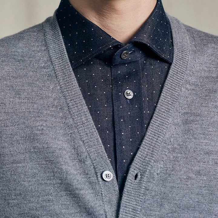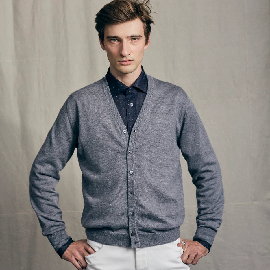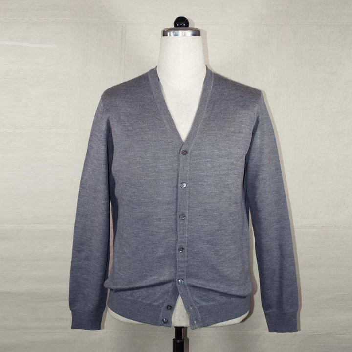 Hergestellt aus feiner 16gg Garn-gefärbter Merinowolle. Das Ergebnis ist ein hervorragender weicher Griff, mit dem Vorteil, dass er in der Maschine gewaschen werden kann. Der Pullover hat eine schmale Silhouette mit schlanken Ärmeln, wodurch er perfekt unter einem Sakko getragen werden kann.