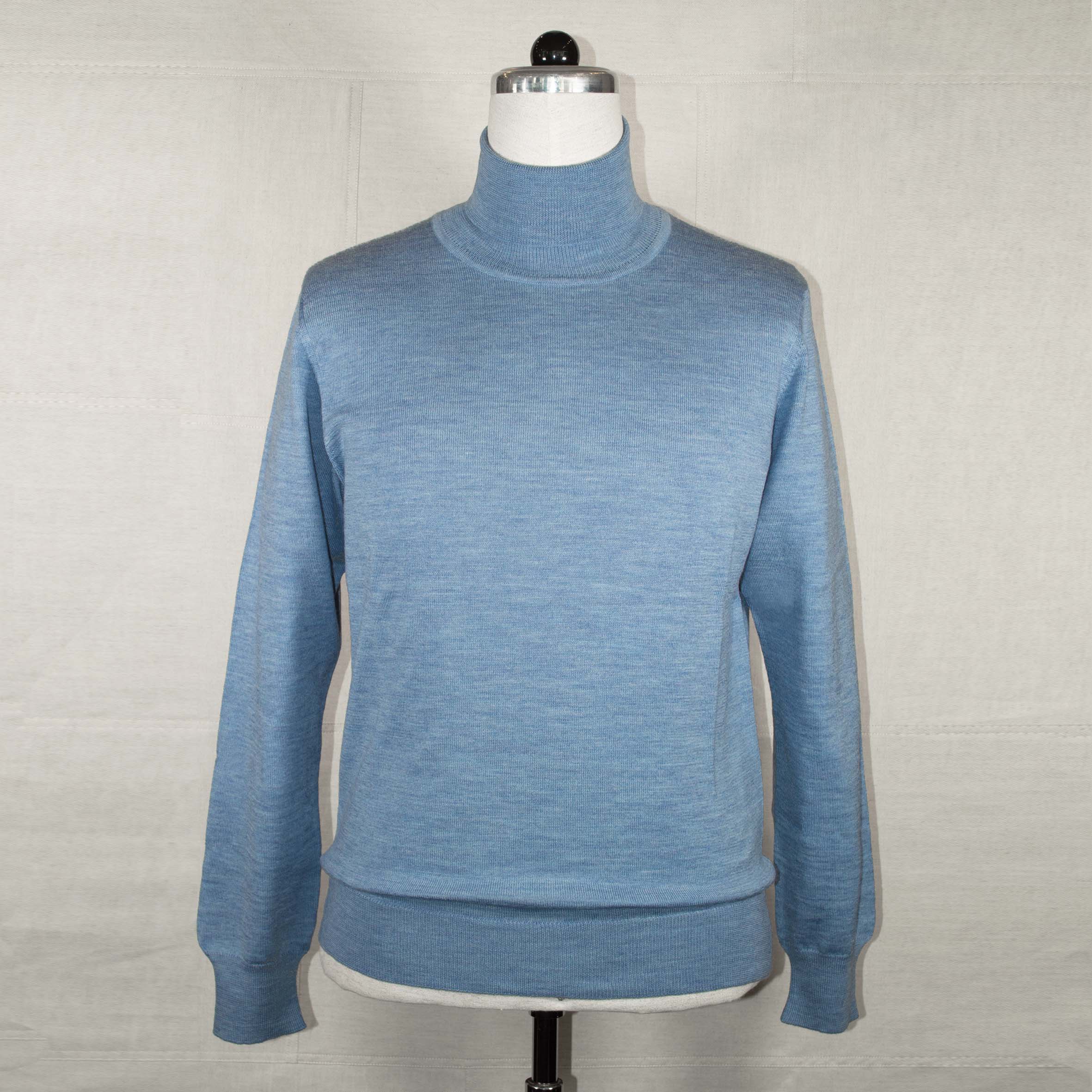 Hergestellt aus feiner 16gg Garn-gefärbter Merinowolle. Das Ergebnis ist ein hervorragender weicher Griff, mit dem Vorteil, dass er in der Maschine gewaschen werden kann. Der Pullover hat eine schmale Silhouette mit schlanken Ärmeln, wodurch er perfekt unter einem Sakko getragen werden kann.