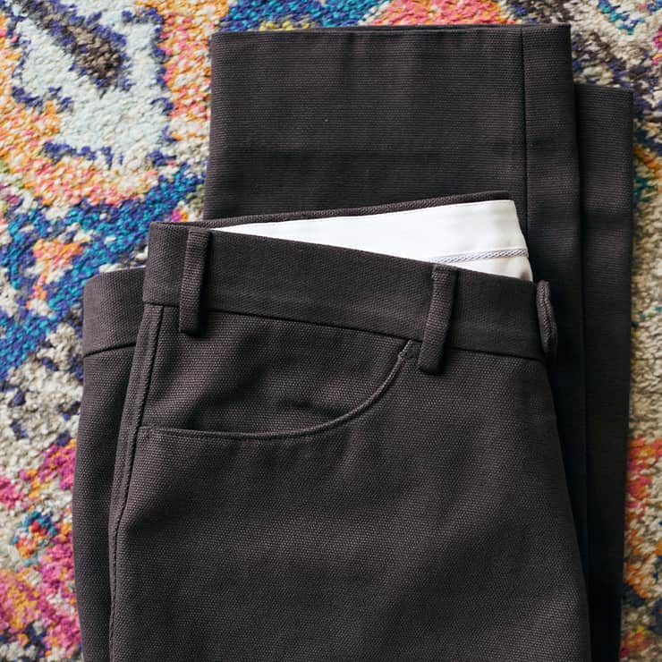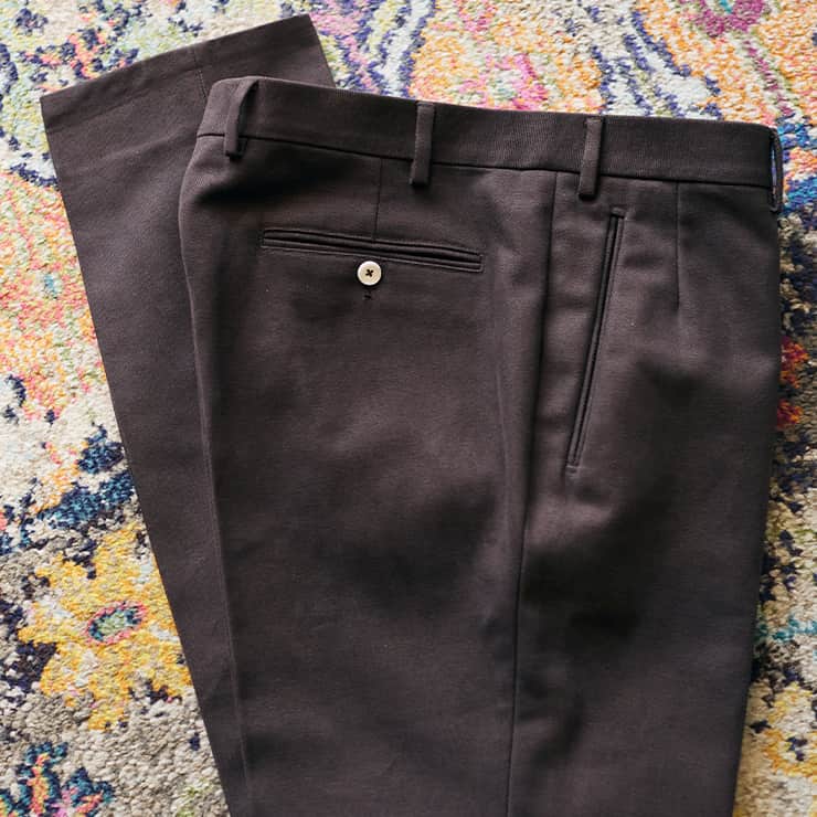 Passendes Beinkleid: Angefertigt aus schwerer dunkelbrauner Baumwolle ist die Hose als Jeansvariante (regular fit) erhältlich. Auch hier erfreuen die Details: zwei runde Stecktaschen vorn, zwei knöpfbare Paspeltaschen hinten (eine mit einem braunen, eine mit einem weißen Knopf), abgesteppte Seitennähte.